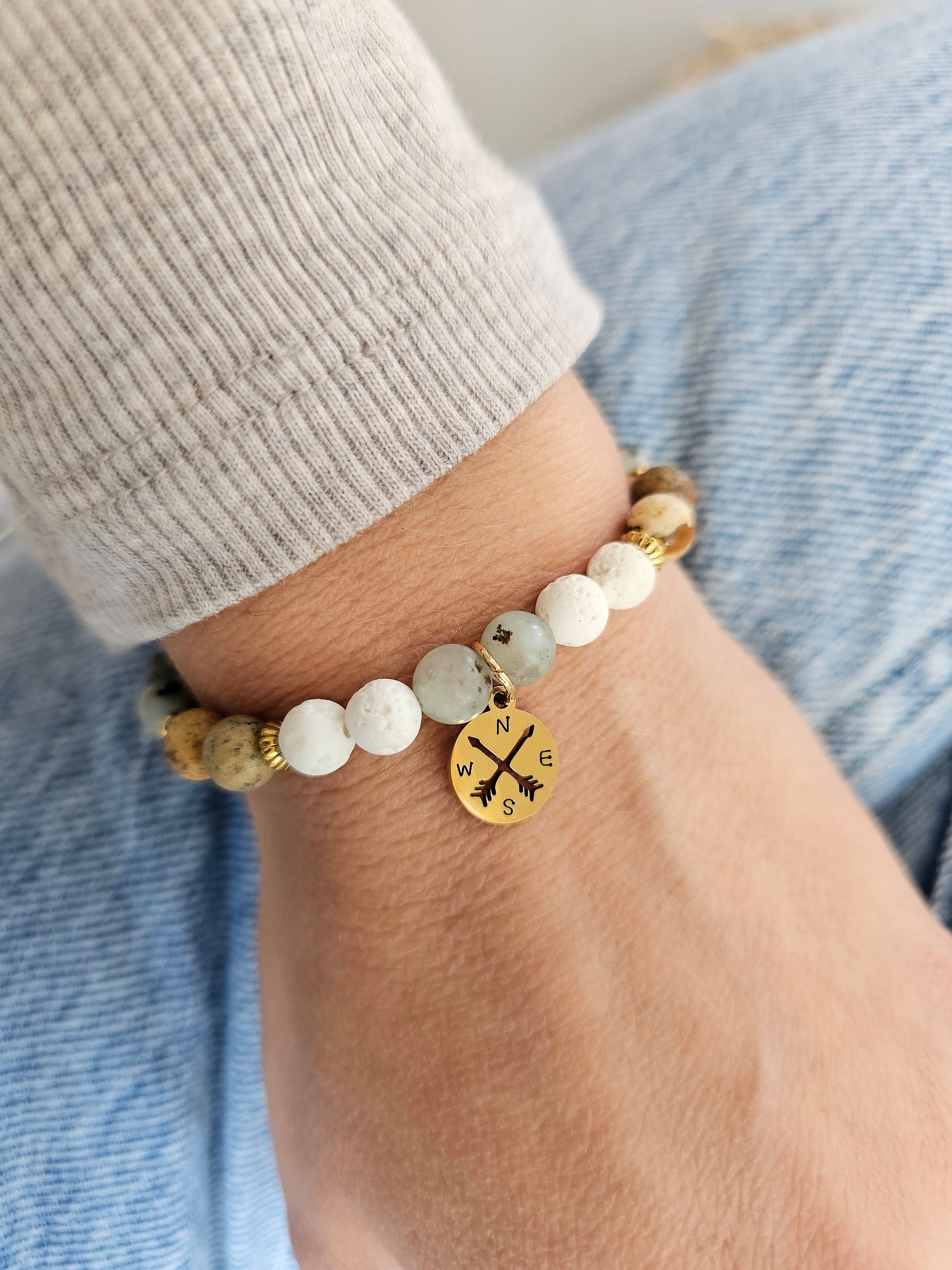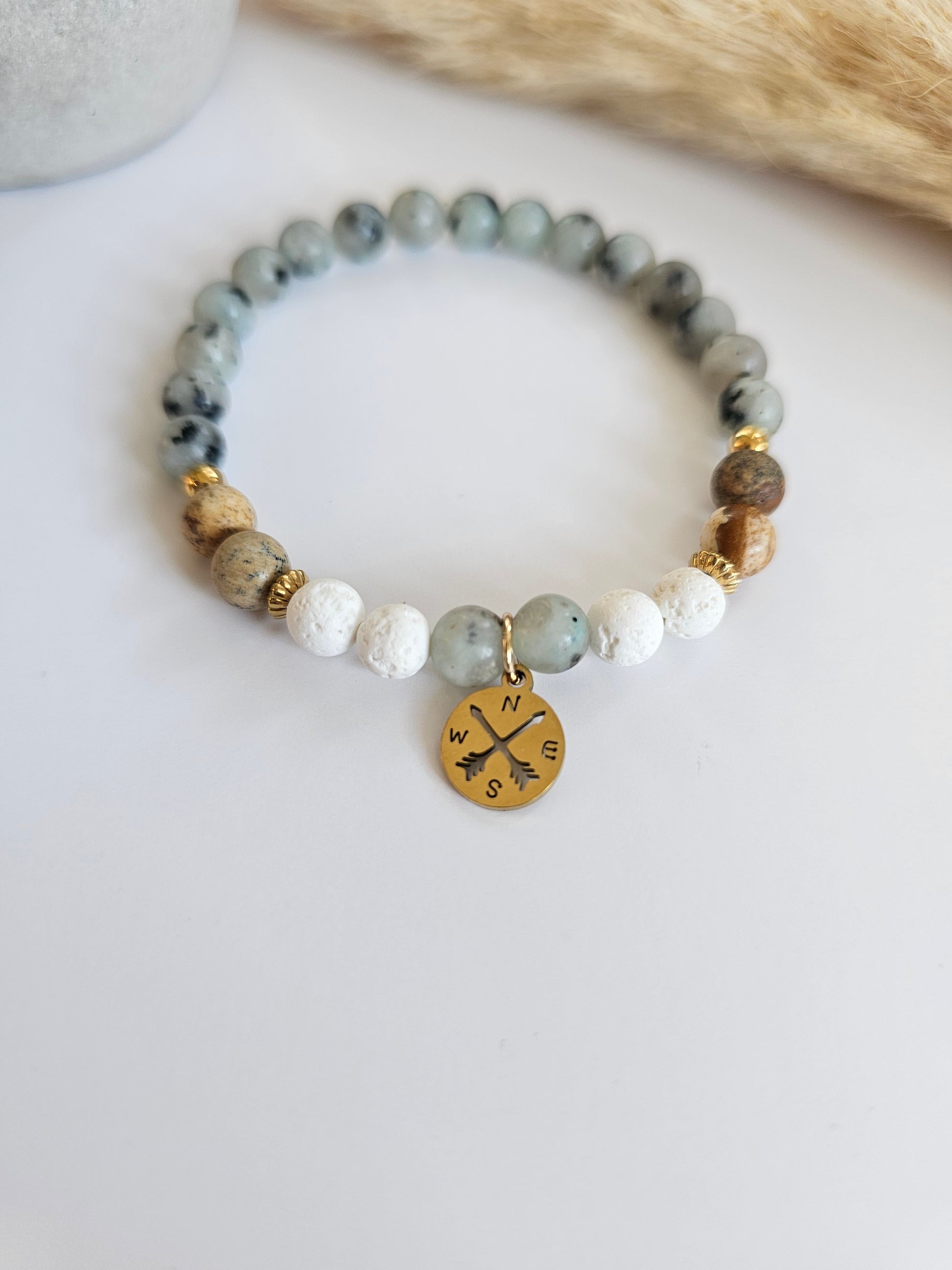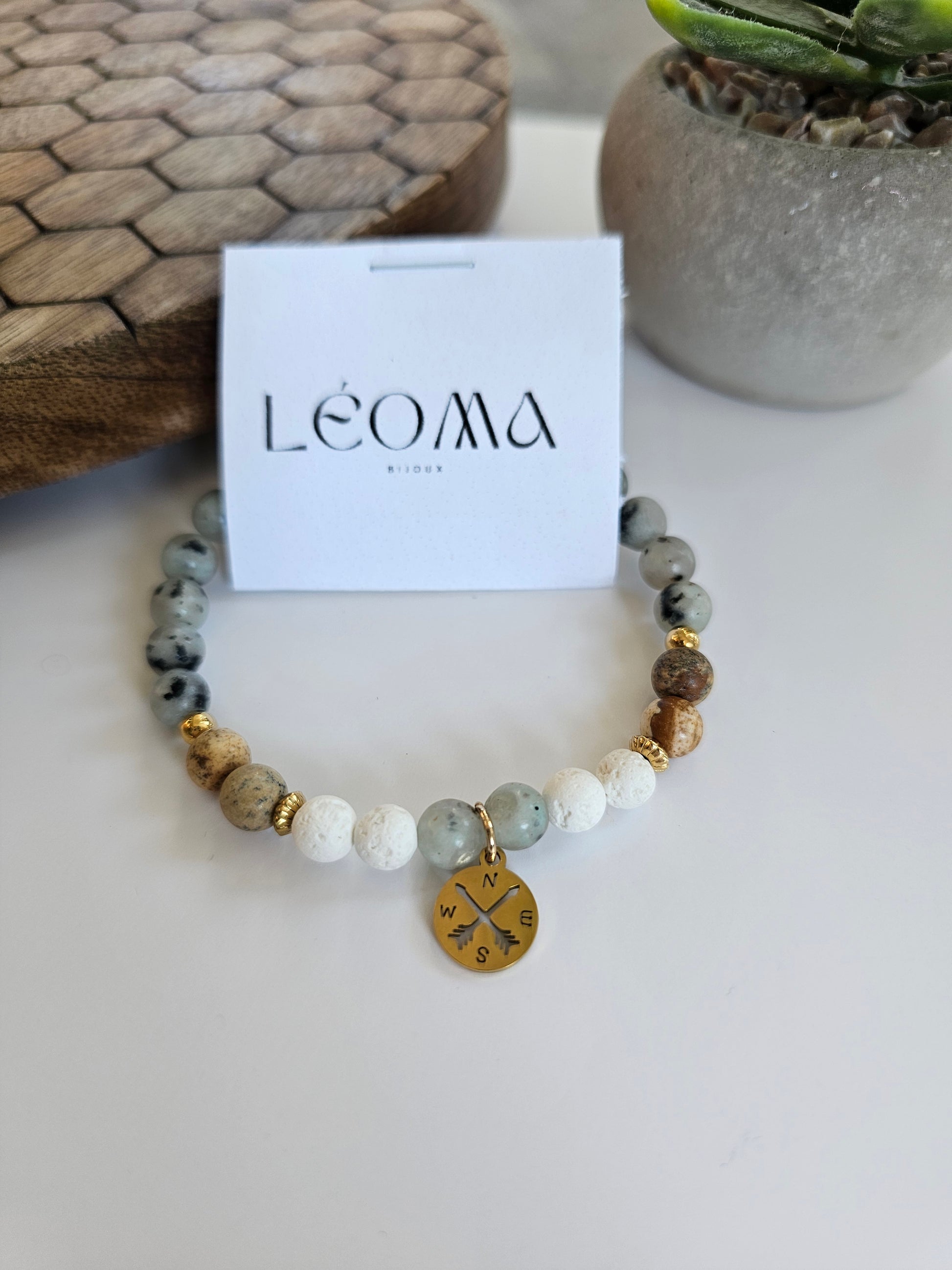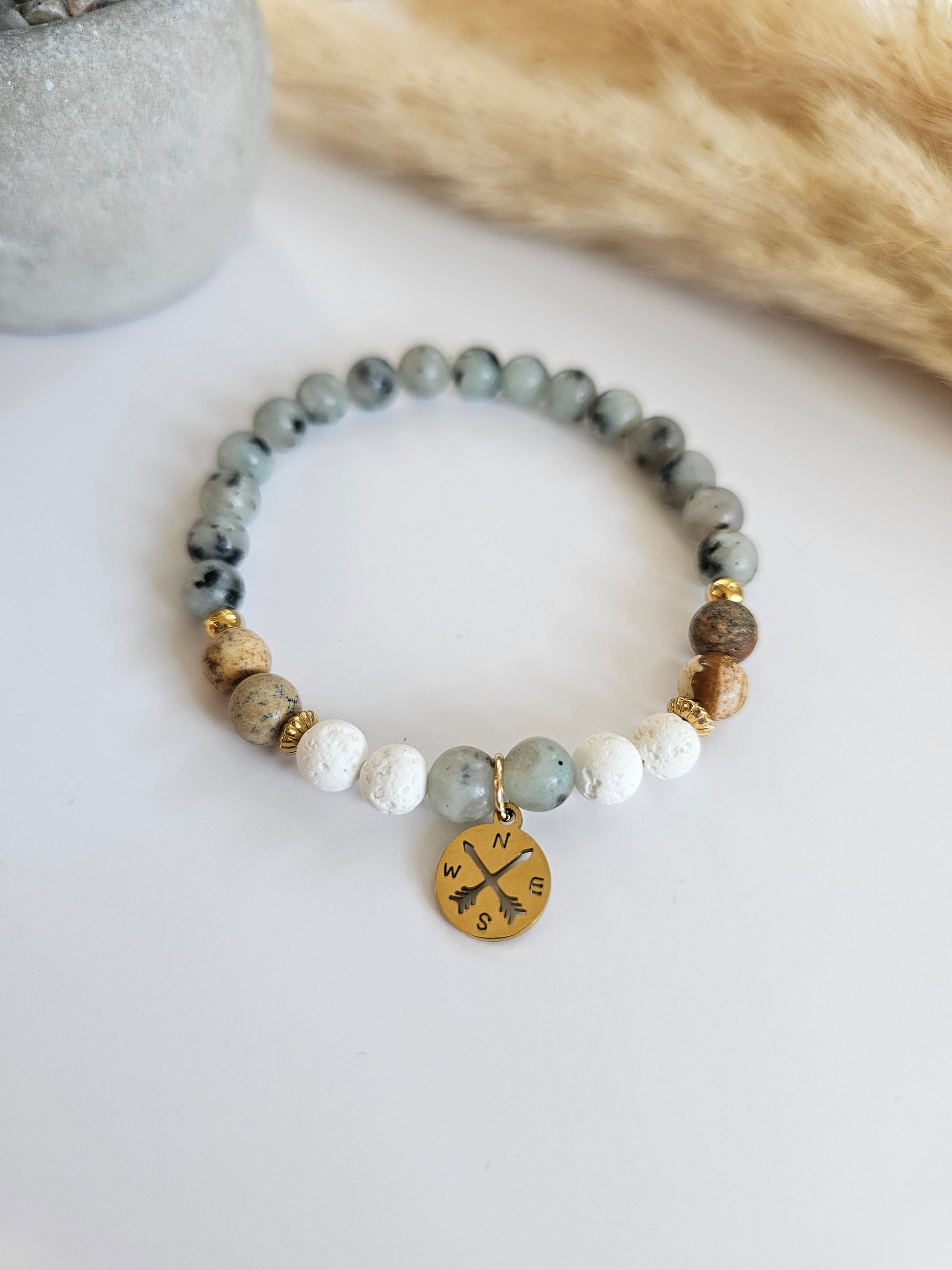 Ce bracelet est composĂ© de perles naturelles aux teintes douces et terreuses, agrĂ©mentĂ© d’un pendentif boussole dorĂ© qui rappelle la libertĂ©, l’orientation et la dĂ©couverte de nouveaux horizons.