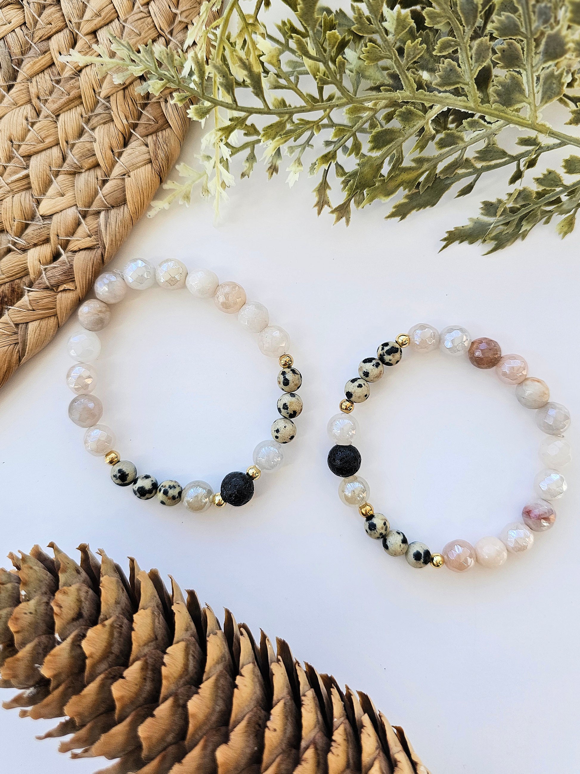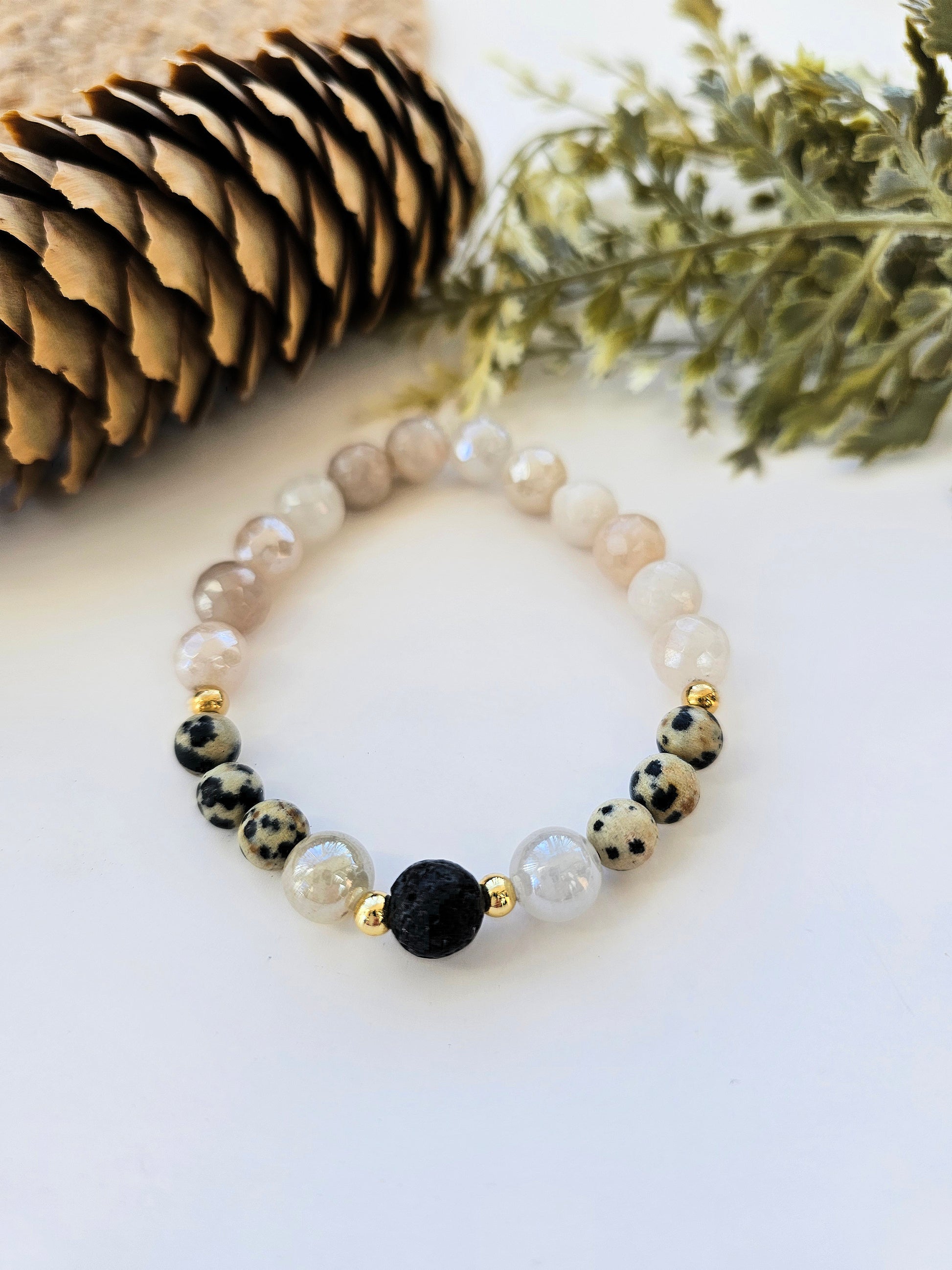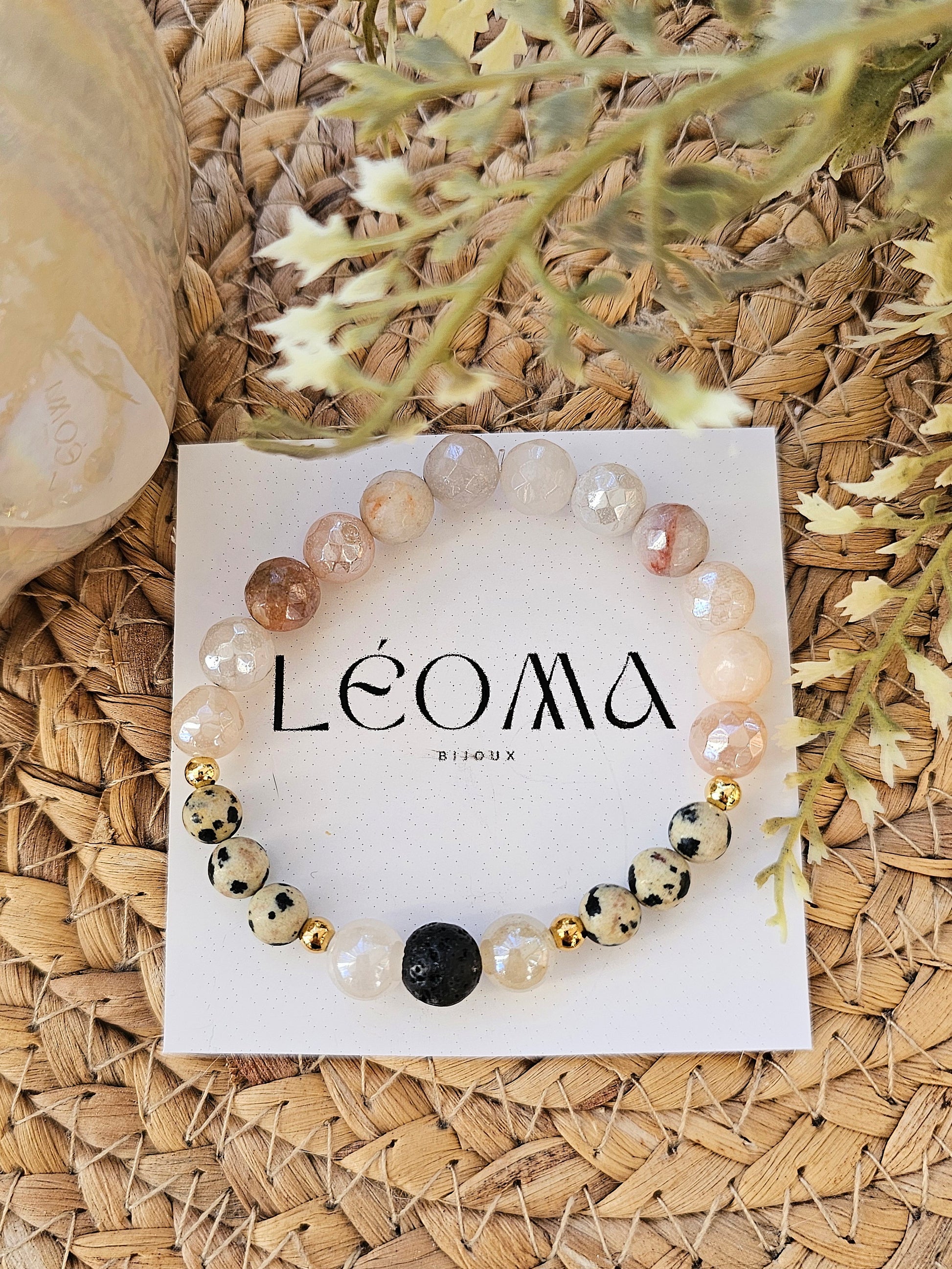 Composé de pierres naturelles en jaspe dalmatien, quartz clair et pierre de lave noire, ce bracelet évoque la sérénité de la nature et la force intérieure.